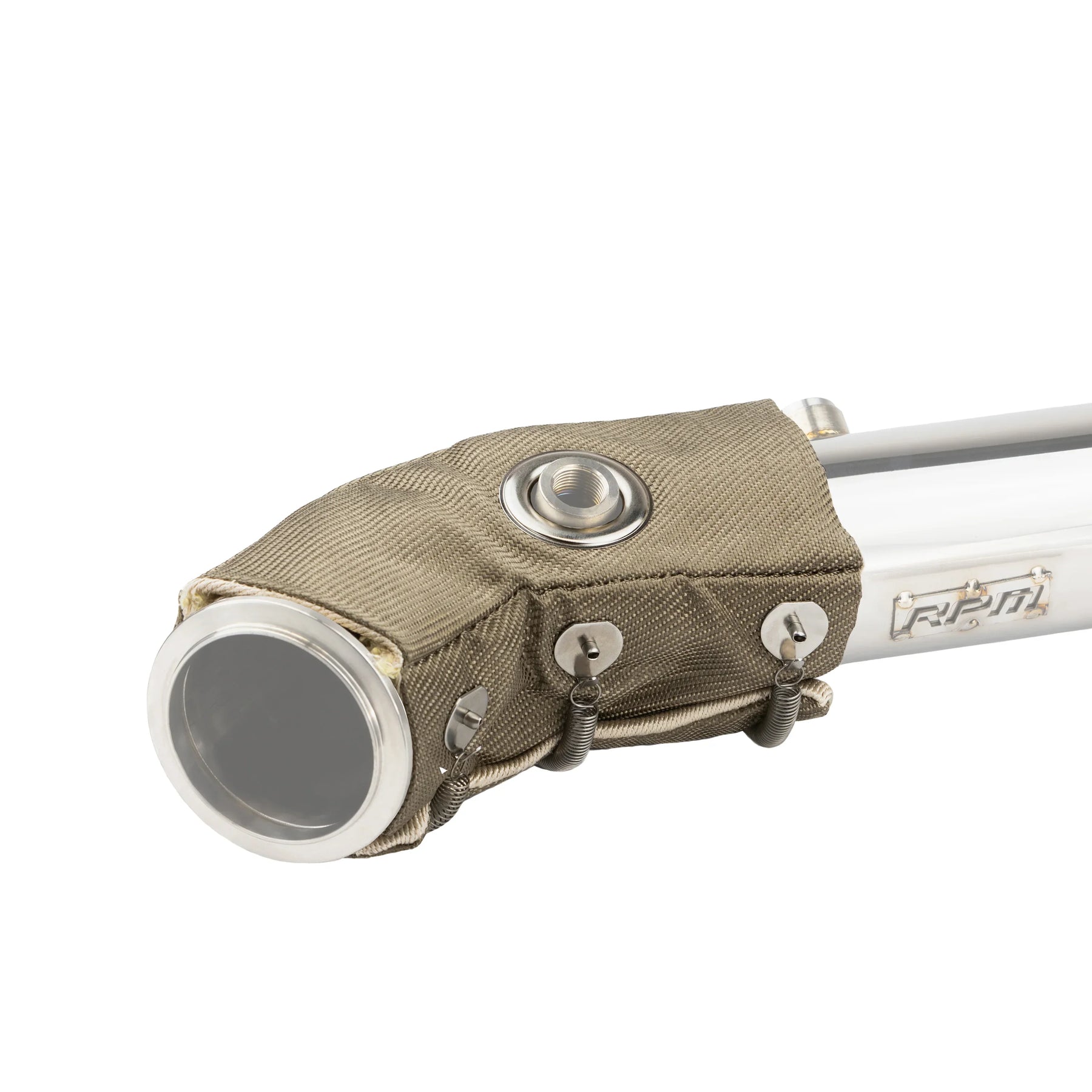 The RPM Heat Blanket snuggly fits the 3" RPM Exhausts for the Can Am Maverick R and perfectly lines up with the O2 bung. The blanket is secured with stainless springs the keep constant pressure and allow for easy removal for cleaning exhausts. Although specifically design for RPM Maverick R exhausts, this will fit other exhausts.