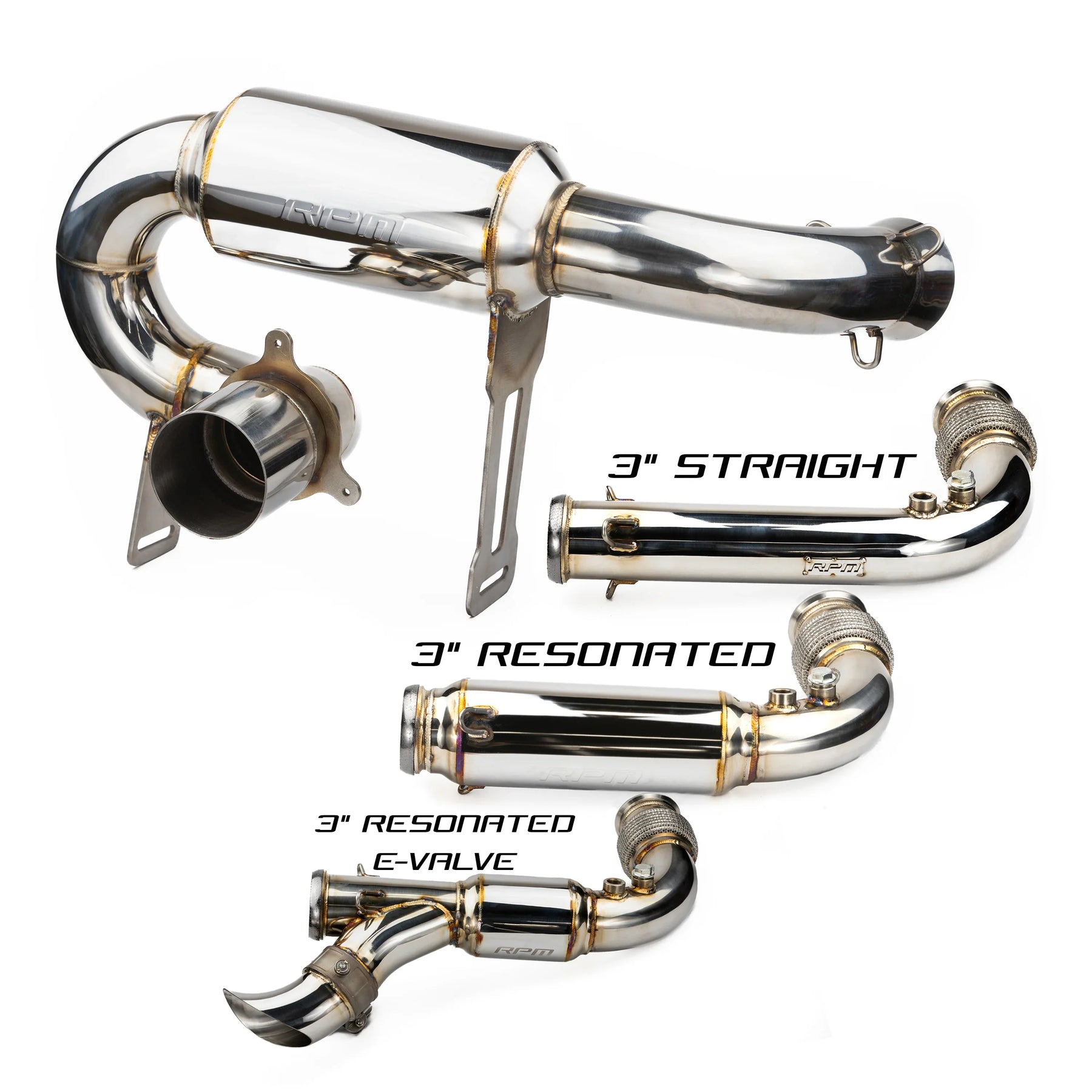 With the popularity of our RPM Sport Muffler and BRP's increase in power over since that exhaust was built PLUS the amount of power these machine are now capable of easily making, we knew it was time to build something bigger! That's what was accomplished! Introducing the FULL 3" Monster Core RPM exhaust system. Starting with our turbo size matched flange we quickly move to the HD chain link flex pipe. From here we move to our smooth transition bend catless mid pipe that has TWO O2 bungs pre installed. Offering 3 styles of mid pipe the Standard 3", Resonated 3", and Resonated 3" E-valve versions. Moving to the muffler we've incorporated a similar design to our 2.5" muffler. The most important part of this party is the 3" perforated muffler with a internal baffle which produces music to the ears. Our muffler system utilizes the factory tip and rear fascia! The factory chassis mounted heat shields can be used, and a new exhaust hanger bracket IS included! Factory spark arrestor can be used.