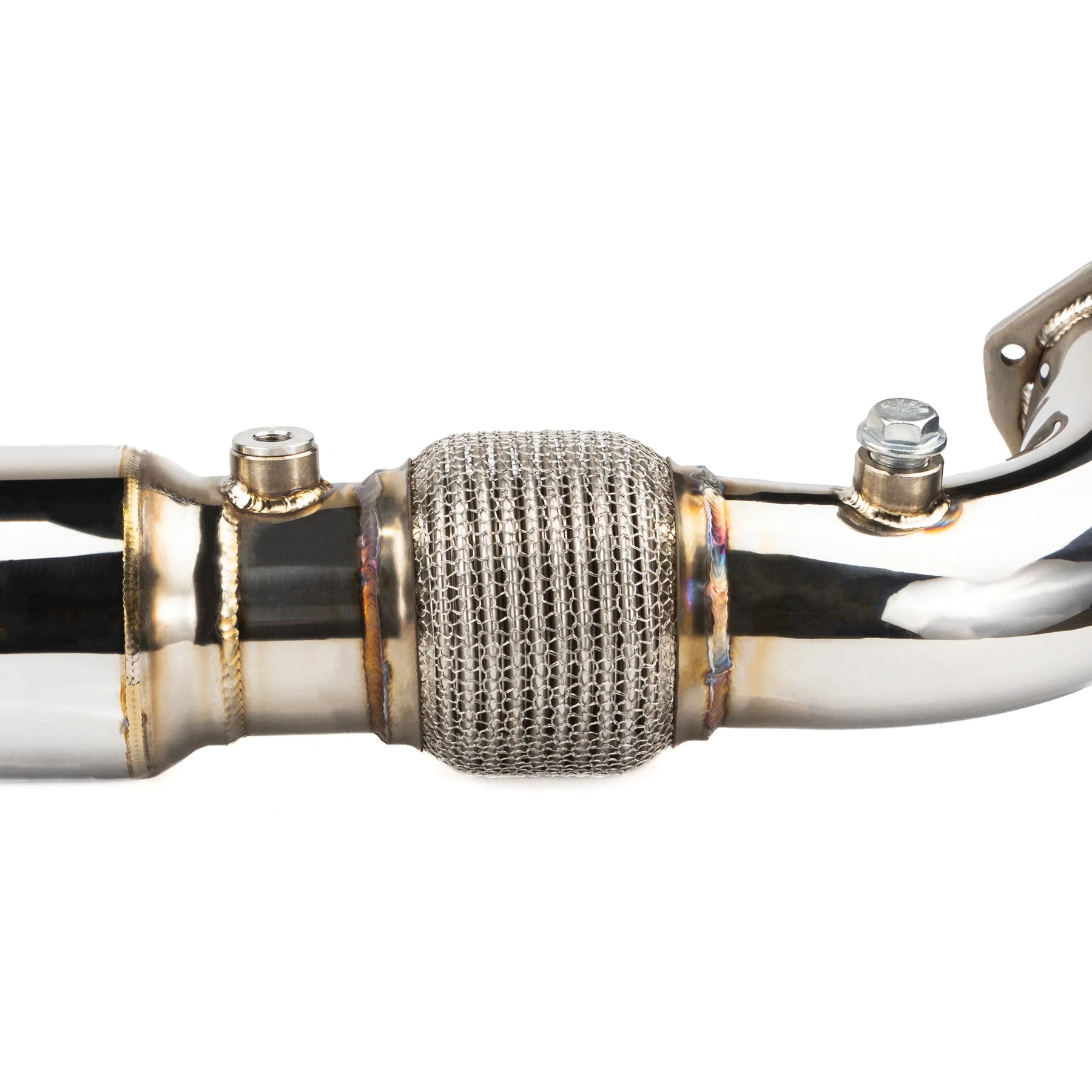 With the popularity of our sport mufflers, & Polaris's bump in HP for their turbo models we knew it was time to step up and provide a FULL 3" exhaust system, and that's what we have mastered! With a deep throaty sound in mind, we mated our 3" mid pipe with a inline muffler to our ever so popular 3" perforated core catless muffler. Our turbo flange is port matched for the absolute highest flowing exhaust on the market & included is our is a port matched turbo manifold gasket. Securing that manifold to the turbo is worry free as we include new grade 8 hardware! The mid pipe is built using a H.D. chain-link flex pipe. The mid pipe and muffler are mated using a stainless v-band clamp connection for a clean free flowing design. For the tip we did a sweeping fish tail and allowed for the use of the stock rear fascia or ditch it and let the world see this piece of art!