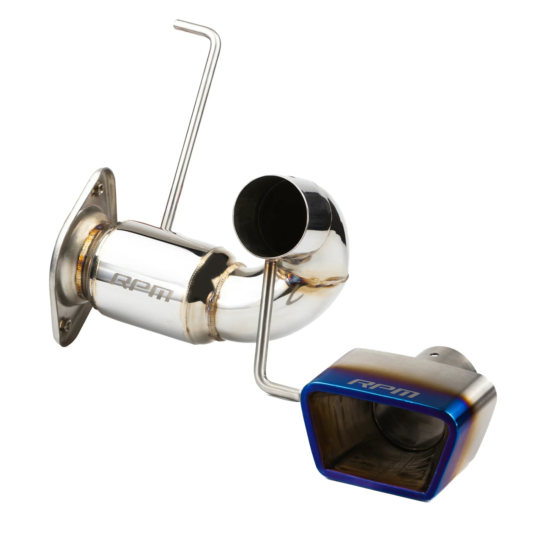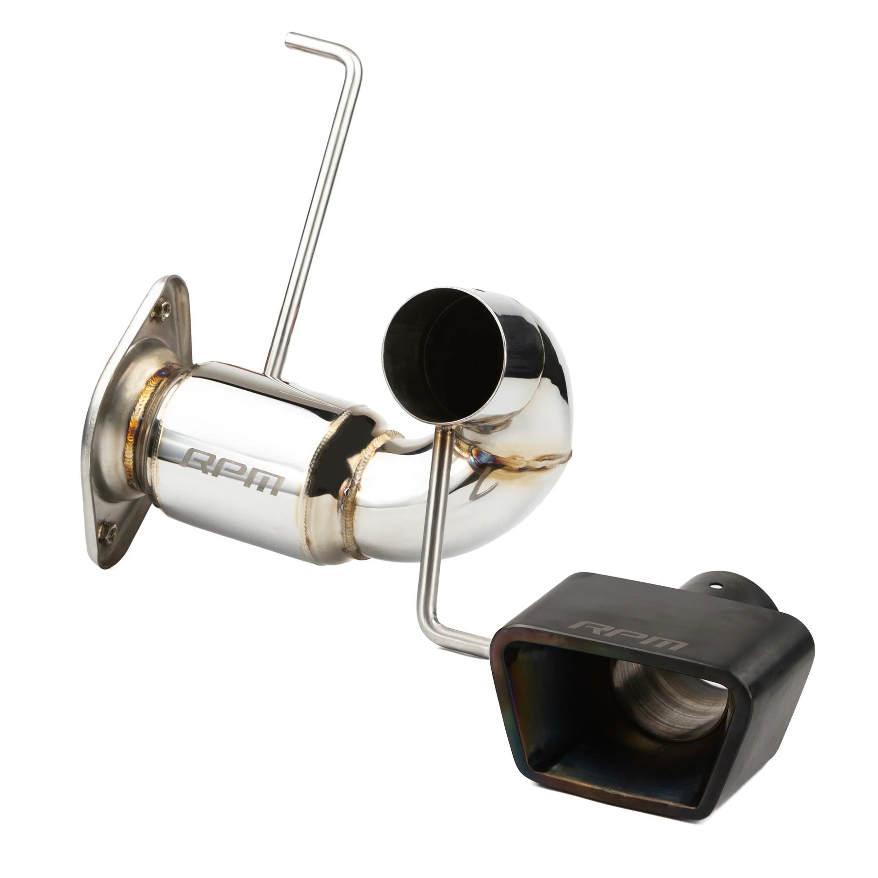 This muffler was designed for those who like LOUD. This uses a 4" bullet muffler with RPM's signature internal "Baffle Blade". This is a internal, unrestrictive baffle that creates the needed back pressure the inline 2.0 liter Pro R needs for optimal performance. This entire muffler weighs in at only 4.5LB's and is designed and built with the racers in mind. The OEM gasket is used & bolts into the factory location. This RPM Race Pipe is built from polished 304 stainless and is a full 3" pipe. This Muffler uses and includes the signature RPM, factory appearing 3" tip!